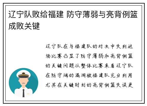 辽宁队在与福建队的对决中失利,这场比赛凸...