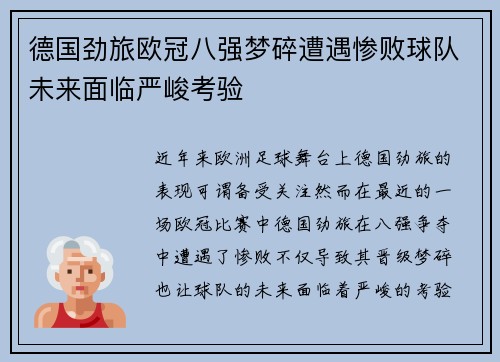 近年来,欧洲足球舞台上,德国劲旅的表现可...