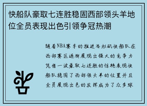 随着NBA赛季的推进,洛杉矶快船队在西部...